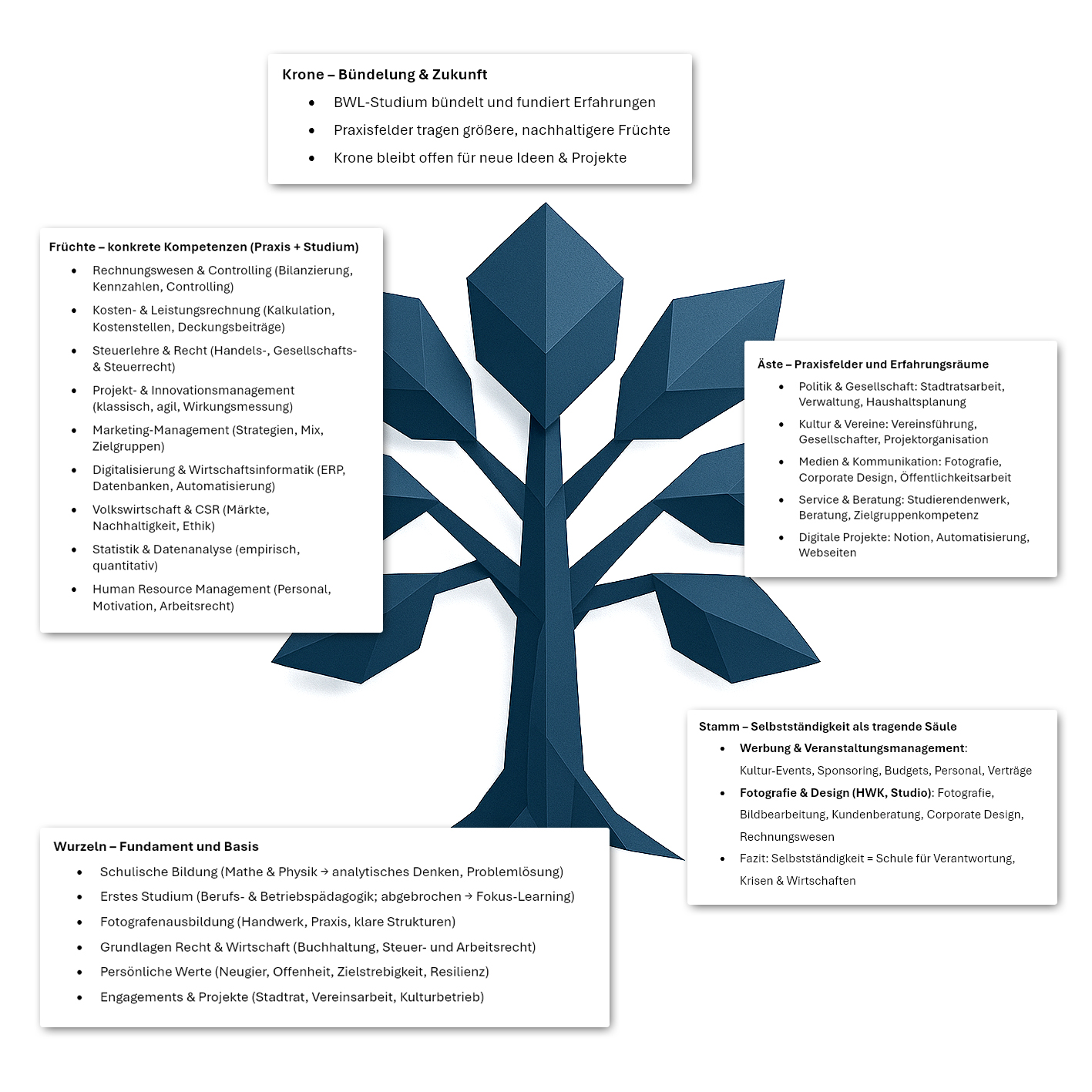 Aufbauend auf meinen bisherigen praktischen Erfahrungen möchte ich meine Kenntnisse im Rahmen des BWL-Studiums systematisch vertiefen und um wissenschaftliche Methoden erweitern. Ziel ist es, aus meiner praxisnahen Kompetenzbasis ein akademisch fundiertes, strategisch nutzbares Kompetenzprofil zu entwickeln.