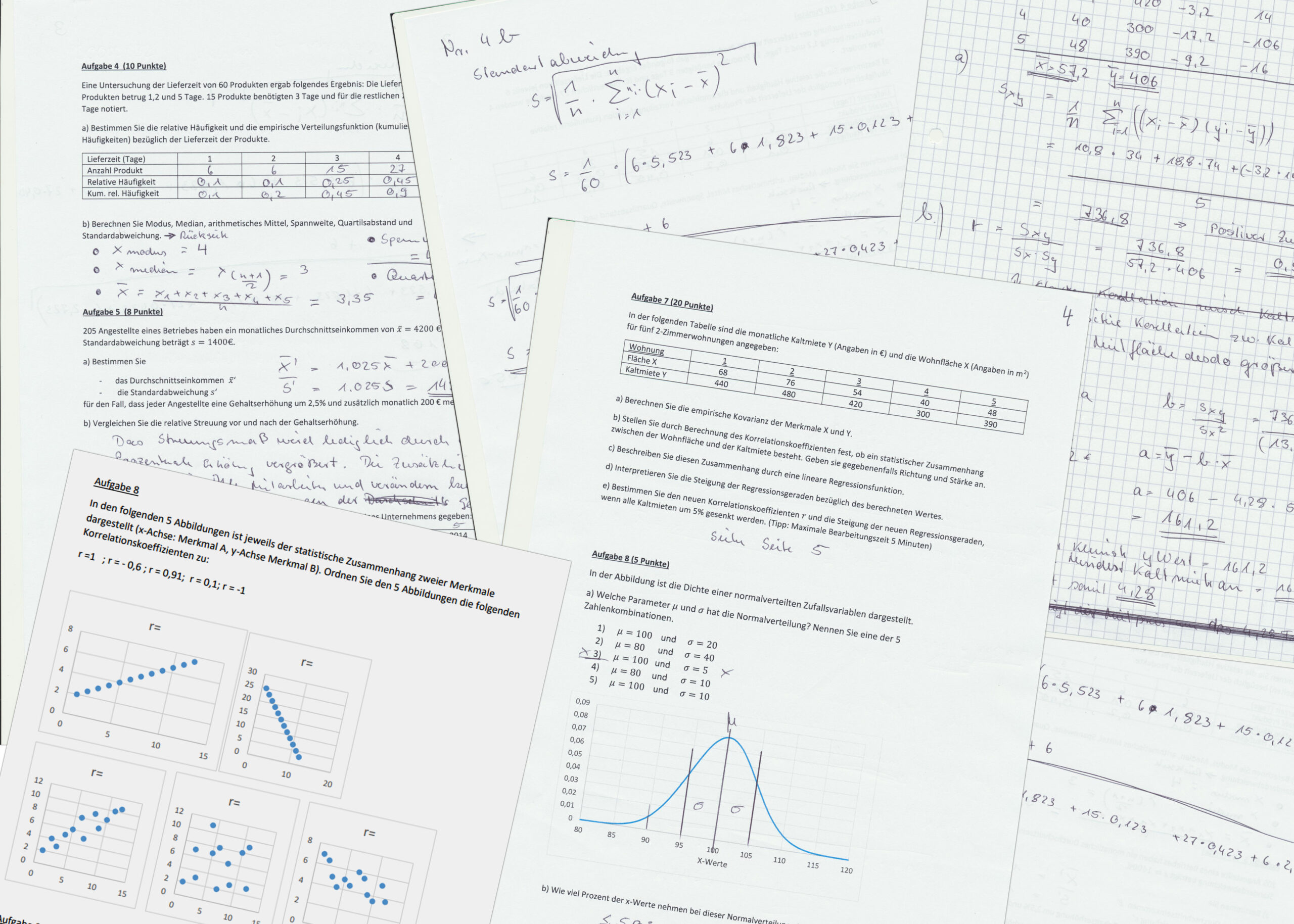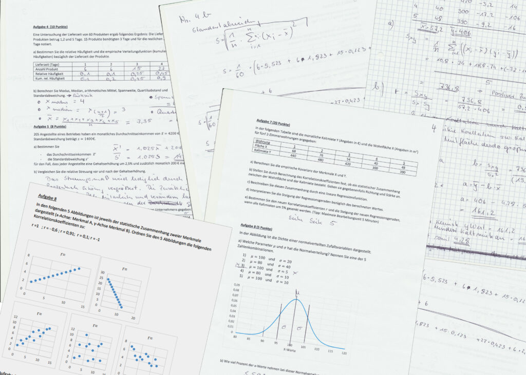 Als Artefakt dient meine gescannte Online-Klausur (Handschrift auf Papier, dann per Mail eingereicht) sowie das begleitende Skript und die Aufgaben-/Anwendungsblätter. Sie zeigen, wie ich Korrelations- und Regressionsrechnungen rechnerisch sicher umgesetzt habe und – mindestens so wichtig – wie ich mit Visualisierungen und Kommentaren von der Zahl zur Aussage gekommen bin. Die Sammlung dokumentiert außerdem den speziellen Prüfungsmodus: fachlich fokussiert, aber im besten Sinne „wohnzimmerkompatibel“. Ein bisschen absurd – Kugelschreiber, Laptopkamera, Scan – aber effizient und fair.